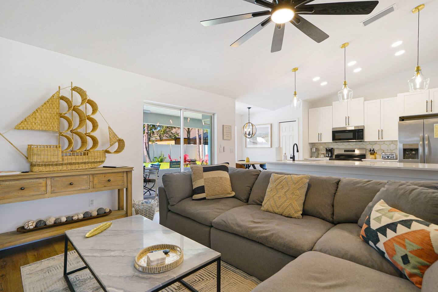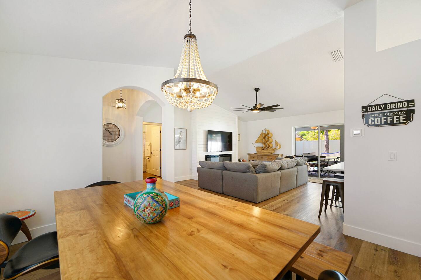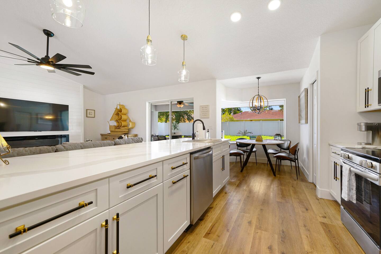 Welcome to our newly added gorgeous Vacation Rental at 24 Fellowship Dr Palm Coast. As you step into this lux coastal retreat, you're immediately greeted by an open-concept space that seamlessly blends the kitchen, dining, and living areas. The gleaming chef's kitchen, a haven for culinary enthusiasts, features top-of-the-line appliances and elegant finishes in a striking white, black, and gold color scheme with a big island that seats 5 people. Picture yourself preparing a gourmet meal while chatting with loved ones gathered around the sleek island or at the stylish huge wooden dining table. The living area with a 65"TV, bathed in natural light, invites you to relax on its plush furnishings and enjoy the modern, clean design that defines the home. Every detail has been thoughtfully curated, creating an atmosphere of sophistication and comfort. Venture further, and you'll find three spacious bedrooms, each designed to be a serene sanctuary. The master suite, with its luxurious ensuite bathroom, offers a spa-like experience with modern fixtures and elegant touches. It offers a king bed and a full over full (bunk), for your kids with a big walk-in closet and a 55"tv. The additional two bedrooms share a beautifully renovated bathroom, ensuring every guest enjoys the same level of comfort and luxury. Second master offers a king size bed, 50" tv and a closet. Third bedroom offers a queen over queen (bunk bed) with tv and a closet. Step outside to discover the true gem of this property: a pristine saltwater pool and a hot tub for 6 persons! Imagine yourself taking a refreshing dip or lounging poolside, soaking in the Florida sunshine in a private, tranquil setting. This newly renovated retreat at 24 Fellowship Dr Palm Coast offers a perfect blend of modern luxury and coastal charm, providing an idyllic retreat for your next getaway. Come and experience the serene beauty and unmatched comfort of our coastal oasis in Palm Coast. Book your stay today and create unforgettable memories. No Parties or Events. No smoking of any kind in house or porch. If you do not have any previous reviews from other hosts - $500 fully refundable damage deposit is required directly to hosts and will be released up to 3 days from check out. Furry Friends As much as we love our furry friends, we accept 1-2 small to medium dogs, with prior confirmation from us and a separate non refundable pet fee, per dog per stay. Please note, that although the yard is fully fenced, the pool is completely open and pets are not allowed in pool or hot tub or on any beds or furnitures. Our Green-Eco Friendly Initiative! We are thrilled to share that as dedicated nature lovers, we are making a significant shift towards eco-friendly practices in all three of our Palm Coast vacation homes by the end of December 2024. This property, 24 fellowship dr. Palm Coast, will lead the way in this green initiative, and we are eager to share the exciting changes with you. Already Offered: Salt water pool - no use of chlorine! Hot-tub for 6. Recycling Efforts: We are providing a single trash bin in the kitchen exclusively for recycling. Recycling day is once a week, making it easy and convenient for you to contribute to reducing waste. Eco-Friendly Body Soap: We have already introduced eco-friendly body soap for your use. Coming by the End of 2024: We will be transitioning to eco-friendly detergents and dishwasher soaps, as well as replacing all cleaning products with eco-friendly alternatives to ensure a healthier living space. We believe that small steps can make a big difference, and your participation is crucial in this journey towards sustainability. We appreciate your support and are always open to more ideas and suggestions in this area. Together, we can make a positive impact on our planet while enjoying the serene beauty of our homes.