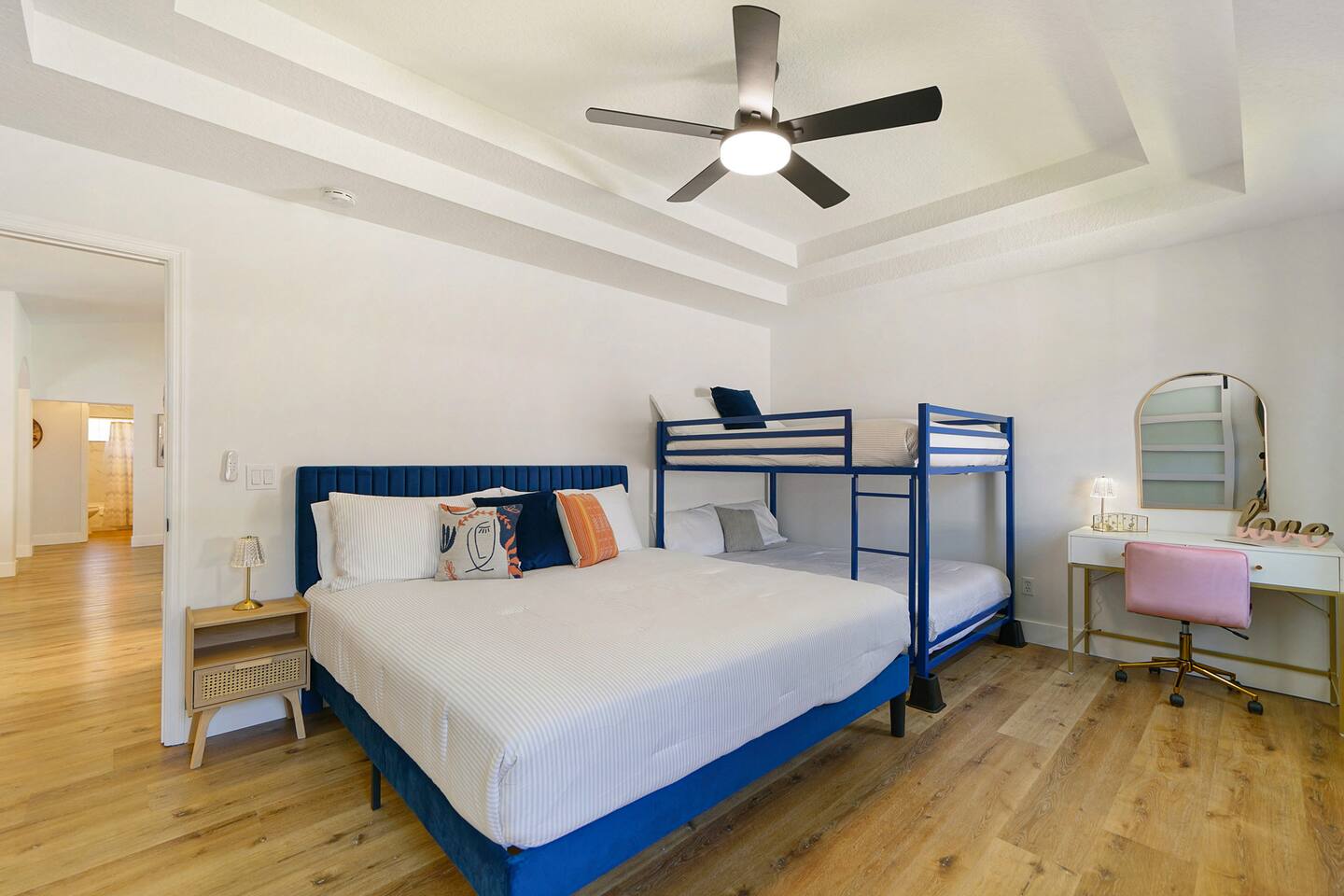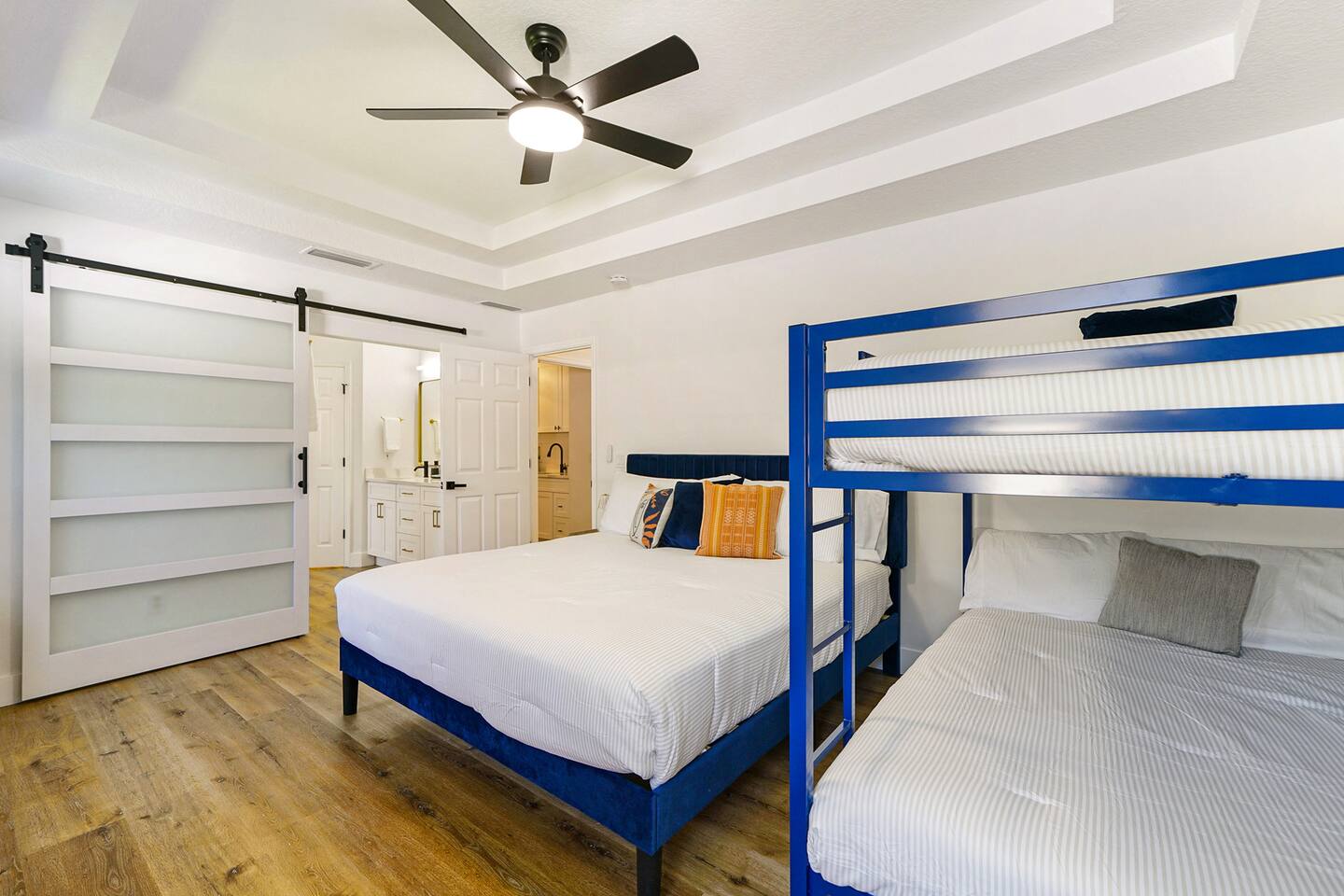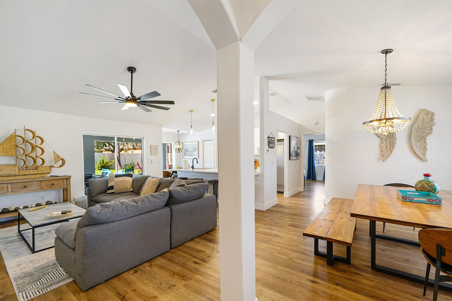 Welcome to our newly added gorgeous Vacation Rental at 24 Fellowship Dr Palm Coast. As you step into this lux coastal retreat, you're immediately greeted by an open-concept space that seamlessly blends the kitchen, dining, and living areas. The gleaming chef's kitchen, a haven for culinary enthusiasts, features top-of-the-line appliances and elegant finishes in a striking white, black, and gold color scheme with a big island that seats 5 people. Picture yourself preparing a gourmet meal while chatting with loved ones gathered around the sleek island or at the stylish huge wooden dining table. The living area with a 65"TV, bathed in natural light, invites you to relax on its plush furnishings and enjoy the modern, clean design that defines the home. Every detail has been thoughtfully curated, creating an atmosphere of sophistication and comfort. Venture further, and you'll find three spacious bedrooms, each designed to be a serene sanctuary. The master suite, with its luxurious ensuite bathroom, offers a spa-like experience with modern fixtures and elegant touches. It offers a king bed and a full over full (bunk), for your kids with a big walk-in closet and a 55"tv. The additional two bedrooms share a beautifully renovated bathroom, ensuring every guest enjoys the same level of comfort and luxury. Second master offers a king size bed, 50" tv and a closet. Third bedroom offers a queen over queen (bunk bed) with tv and a closet. Step outside to discover the true gem of this property: a pristine saltwater pool and a hot tub for 6 persons! Imagine yourself taking a refreshing dip or lounging poolside, soaking in the Florida sunshine in a private, tranquil setting. This newly renovated retreat at 24 Fellowship Dr Palm Coast offers a perfect blend of modern luxury and coastal charm, providing an idyllic retreat for your next getaway. Come and experience the serene beauty and unmatched comfort of our coastal oasis in Palm Coast. Book your stay today and create unforgettable memories. No Parties or Events. No smoking of any kind in house or porch. If you do not have any previous reviews from other hosts - $500 fully refundable damage deposit is required directly to hosts and will be released up to 3 days from check out. Furry Friends As much as we love our furry friends, we accept 1-2 small to medium dogs, with prior confirmation from us and a separate non refundable pet fee, per dog per stay. Please note, that although the yard is fully fenced, the pool is completely open and pets are not allowed in pool or hot tub or on any beds or furnitures. Our Green-Eco Friendly Initiative! We are thrilled to share that as dedicated nature lovers, we are making a significant shift towards eco-friendly practices in all three of our Palm Coast vacation homes by the end of December 2024. This property, 24 fellowship dr. Palm Coast, will lead the way in this green initiative, and we are eager to share the exciting changes with you. Already Offered: Salt water pool - no use of chlorine! Hot-tub for 6. Recycling Efforts: We are providing a single trash bin in the kitchen exclusively for recycling. Recycling day is once a week, making it easy and convenient for you to contribute to reducing waste. Eco-Friendly Body Soap: We have already introduced eco-friendly body soap for your use. Coming by the End of 2024: We will be transitioning to eco-friendly detergents and dishwasher soaps, as well as replacing all cleaning products with eco-friendly alternatives to ensure a healthier living space. We believe that small steps can make a big difference, and your participation is crucial in this journey towards sustainability. We appreciate your support and are always open to more ideas and suggestions in this area. Together, we can make a positive impact on our planet while enjoying the serene beauty of our homes.